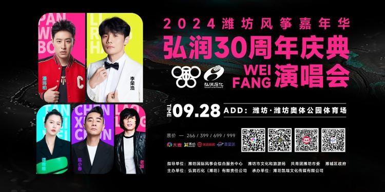 2024潍坊风筝嘉年华弘润30周年庆典演唱会由潍坊国际风筝会综合服务中心、潍坊市文化和旅游局、共青团潍坊市委、潍城区政府指导,弘润石化(潍坊)有限责任公司主办,潍坊凯瑞文化传媒有限公司承办。李荣浩、潘玮柏、谭维维、老狼、陈小春五位实力唱将齐聚潍坊,呈现一场震撼心灵的视听盛宴。
