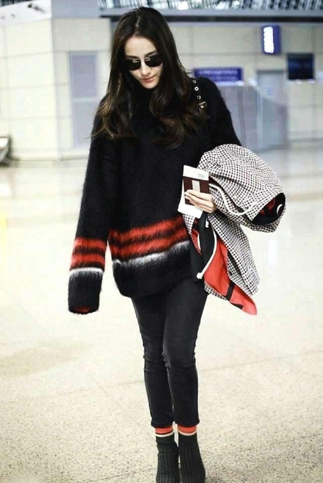 迪丽热巴身穿黑红条纹毛衣,下身穿黑色紧身裤,脚穿袜靴,整体造型看着既随性又舒服。