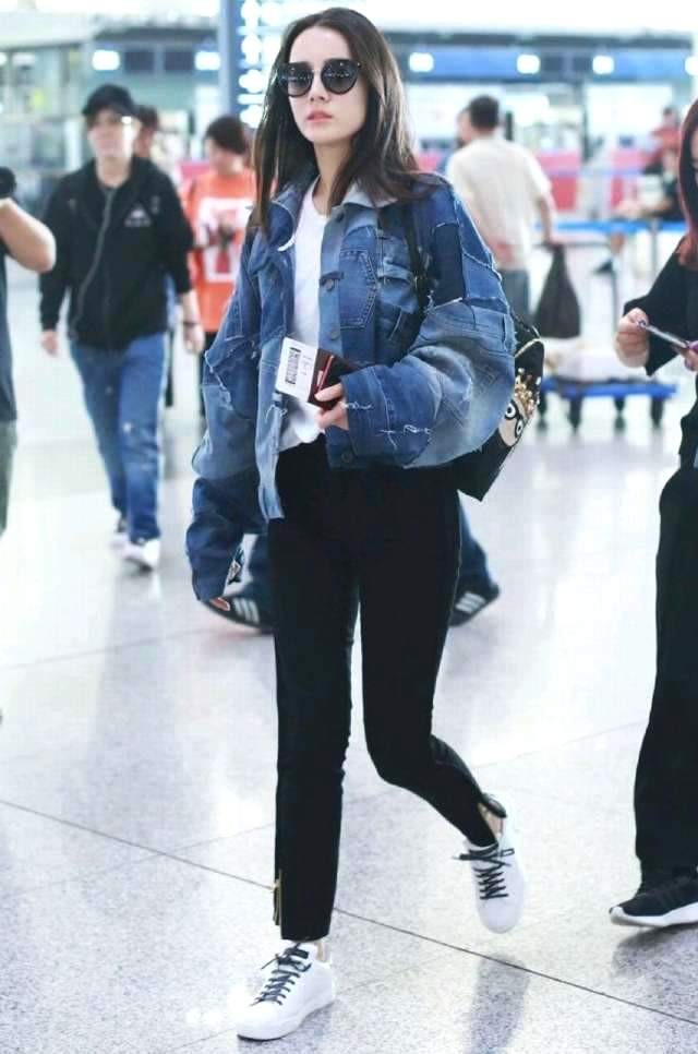 迪丽热巴身穿做旧拼接的牛仔短外套展现帅气,白色T恤和黑色紧身裤简单搭配,一身机场装舒适与时髦兼具。
