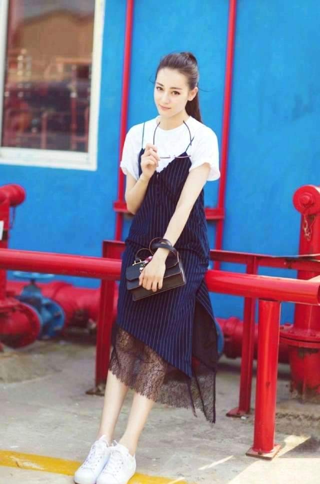 迪丽热巴身穿白色T恤搭配吊带蕾丝边裙,干净清爽又看起来轻柔无比,肩挎黑色手袋十分精致,脚穿一双白色运动鞋活力可爱。