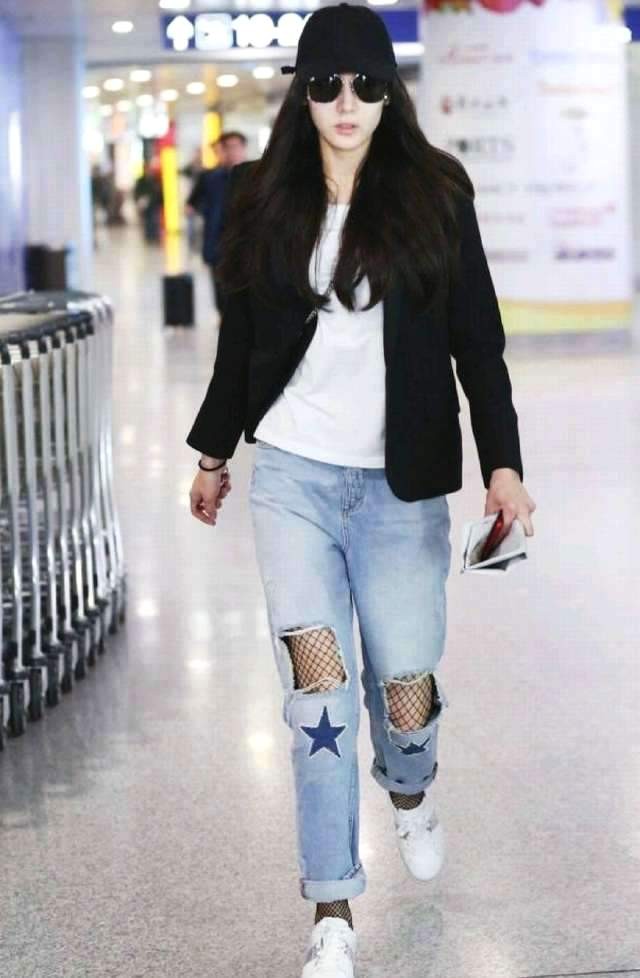 迪丽热巴身穿黑色小西服搭配白色T恤和牛仔破洞裤,中性休闲,小白鞋今年人气依旧。破洞裤与渔网袜的组合霸屏街拍,势头正猛。