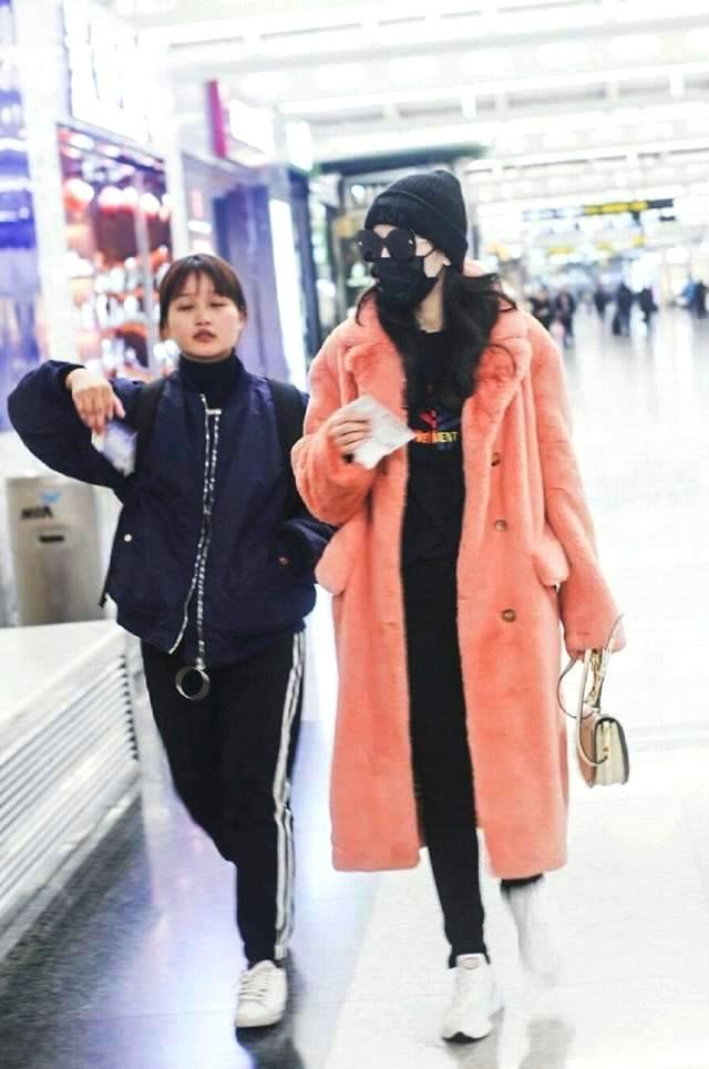迪丽热巴身穿粉色毛绒大衣内搭印花T恤,自带减龄功效很有活力感,搭配一双小白鞋,更加清爽休闲。