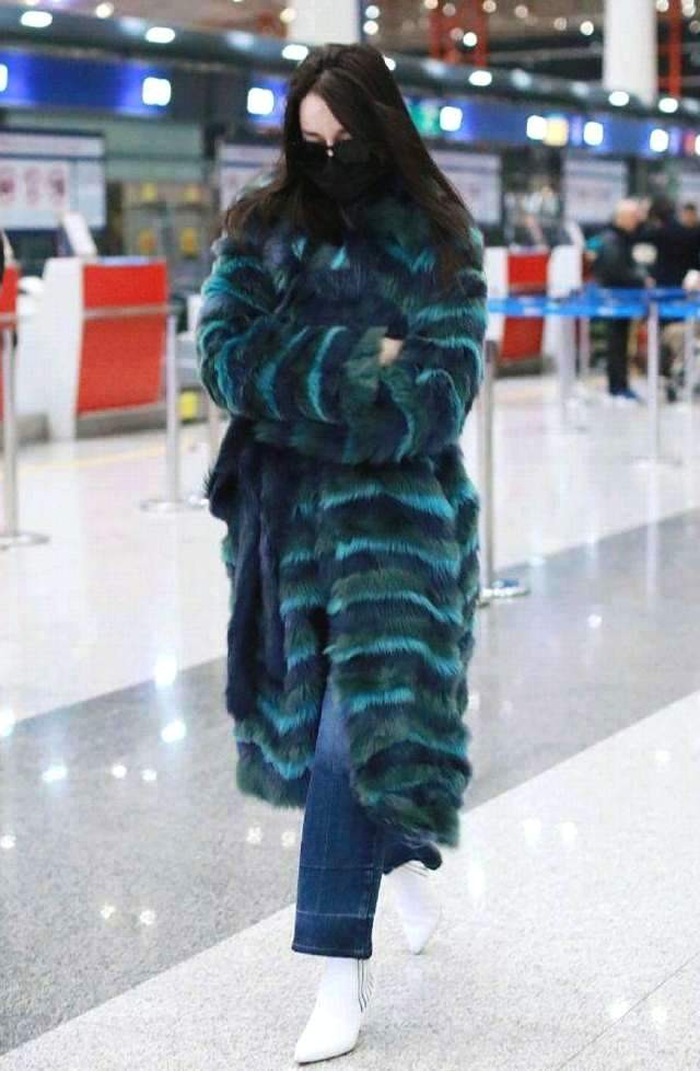 迪丽热巴身穿绿色系条纹毛绒长外套贵气十足,搭配白色高跟靴减轻沉闷感。