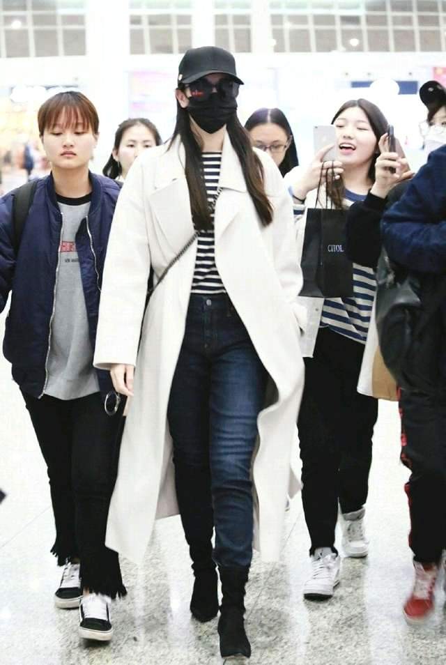 迪丽热巴现身机场,身穿白色开叉呢子大衣,内搭蓝白拼色条纹T恤,立体的廓形格外衬托气场,下身牛仔裤搭配尖头高跟袜靴的组合,酷酷的样子很养眼。