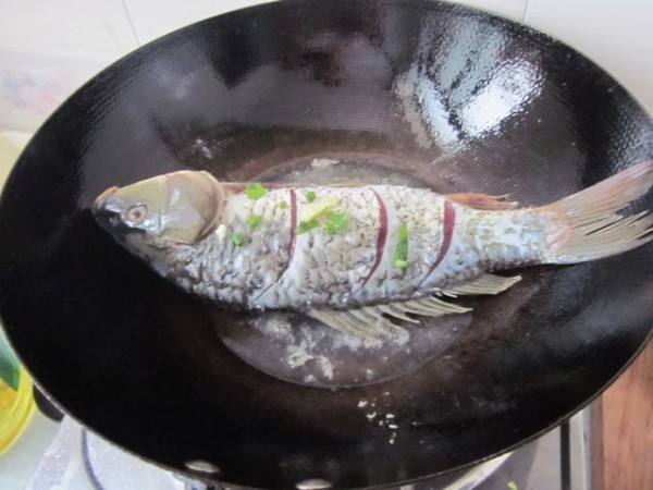 起锅烧油(热锅凉油),待油至六成热的时候,沿锅边将鱼滑入锅内,煎至定型(不要着急翻动鱼,以免破皮),待两面金黄后盛到盆里备用。