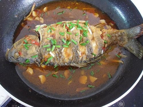 2、如果鱼比较大的话,鱼头鱼尾浸不到汤汁的地方,自行将锅稍微偏转一点,保证能炖到就行。