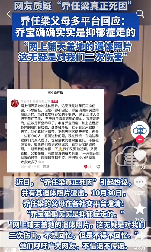 更过分的是乔任梁的遗体照被不怀好意的人在网络上疯传,这一恶劣行为不仅严重侵犯了死者的隐私和尊严,也让公众对这种不道德的行为感到愤怒和震惊。