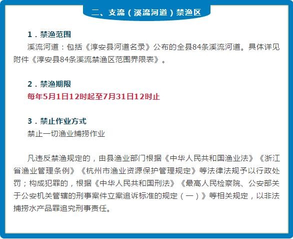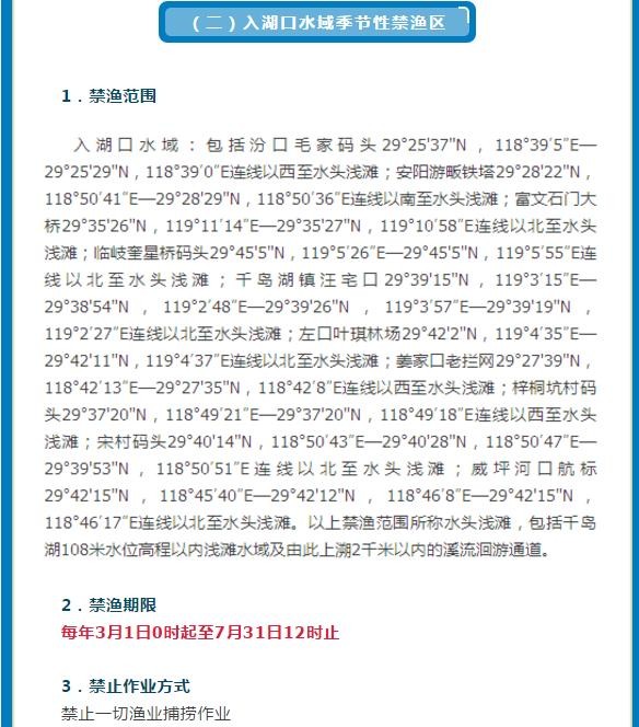 根据禁渔要求,千岛湖除常年禁渔区外,入湖口禁渔区的禁捕期从每年3月1日0时至7月31日12时止,为期5个月;其它水域季节性禁渔区的禁捕期为每年3月1日0时至6月30日24时止;支流禁渔期为每年5月1日12时至7月31日12时止。