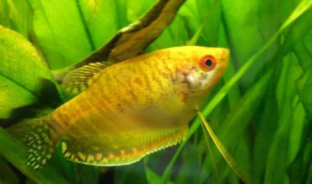 黄曼龙鱼属于丝足鲈科。它起源于泰国和马来西亚,体长10-20厘米。它是蓝色龙鱼的变种。黄曼龙鱼体长而椭圆形,体扁平,尾鳍浅叉状,体长可达14厘米。鱼的身体是金黄色的,眼睛是红色的,鳍是银白色的,顶部覆盖着金色的斑点,在阳光下闪闪发光。