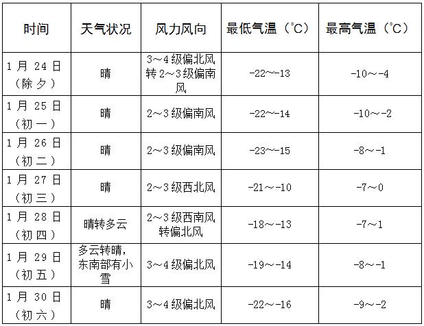 明天夜间到后天白天:晴,西北风转西南风3-4级,市区最低气温:-18度,最高气温:-7度。