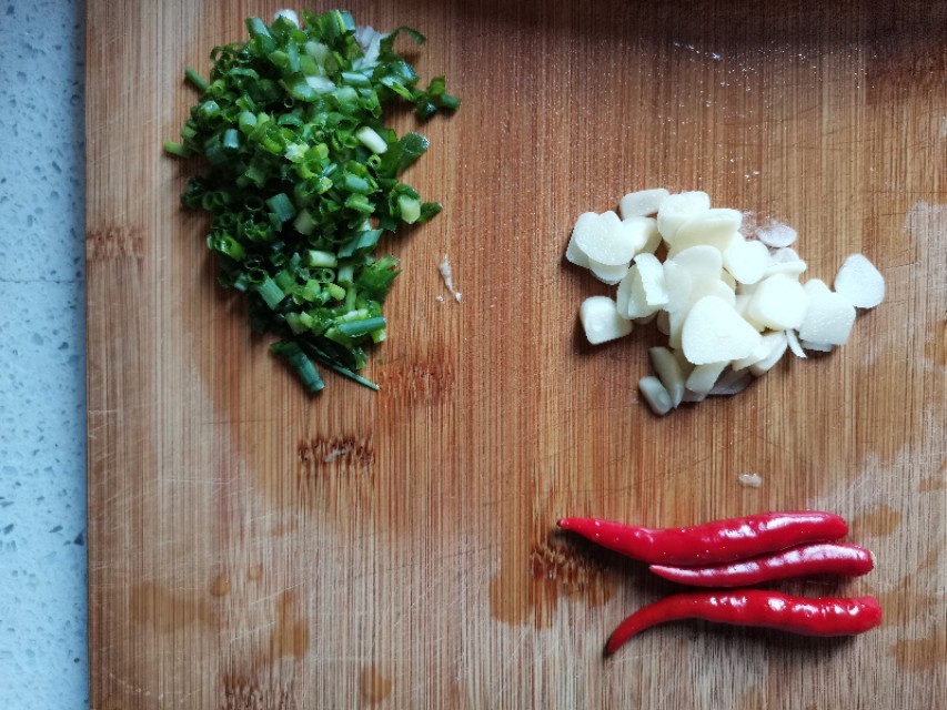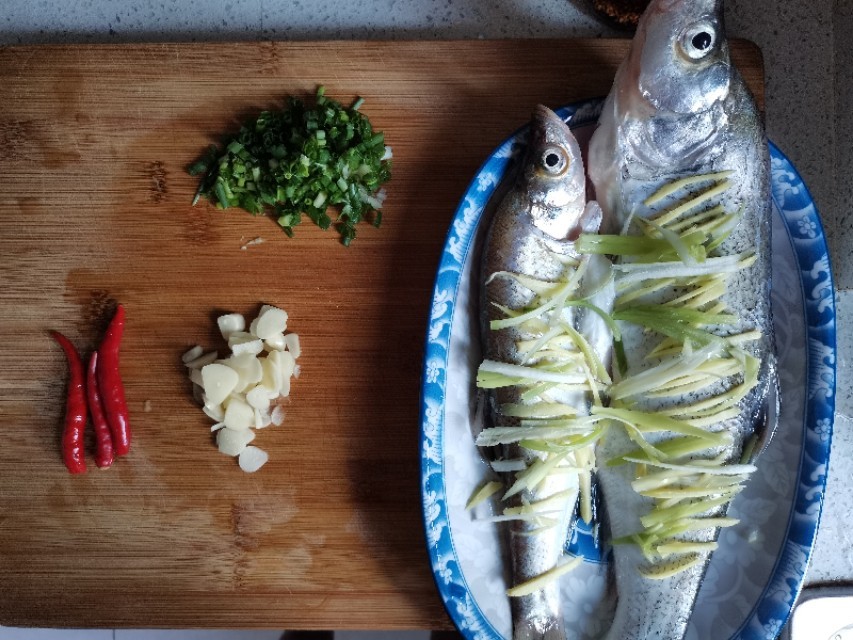 2-鱼身表面抹少许花椒油(或者炸些花椒油),將大葱、生姜切丝,蒜切片,喜欢吃辣的,可以放些干辣椒,覆在鱼上,小葱、小米辣最后留用(这两样不适合上锅蒸)。