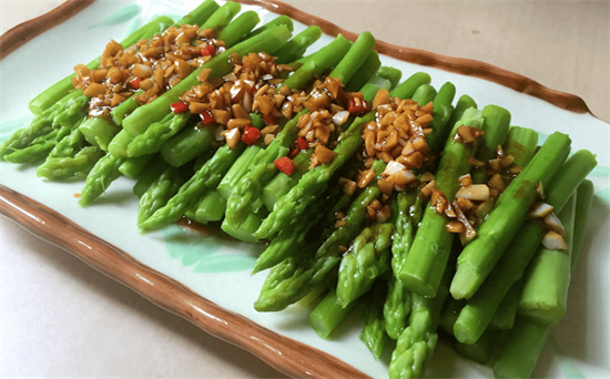 具体做法如下:芦笋洗净切掉去根部,适当刨去老皮,锅中烧开水,加少许盐,将芦笋放入汆烫1~2分钟,捞出过凉水沥干备用,将芦笋一切为二,按照自己的喜好排列,码入盘中,淋上蒸鱼豉油,放上蒜末和辣椒干,起油锅放入少许油烧热后浇在蒜末上激发香味!