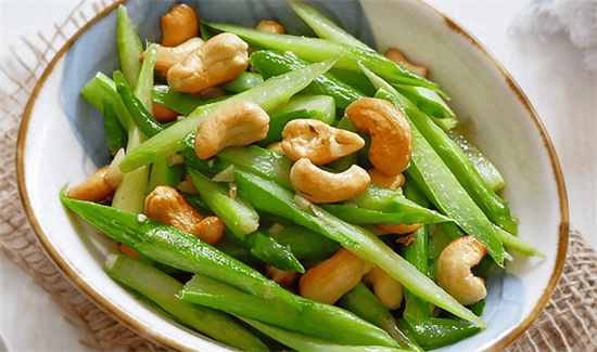 具体做法如下:芦笋用清水冲洗干净,将老头切除,然后切成斜刀段,放入开水中焯熟,约2-3分钟,将焯熟的芦笋倒入冷开水中浸泡一会,再将水倒掉,并挤出多余的水分,冷油下入腰果,开启中小火炒制,炒至金黄关火,捞出放凉,待腰果冷却后倒入芦笋中,并调入盐、味极鲜、白醋、糖、芝麻油,拌匀即可!