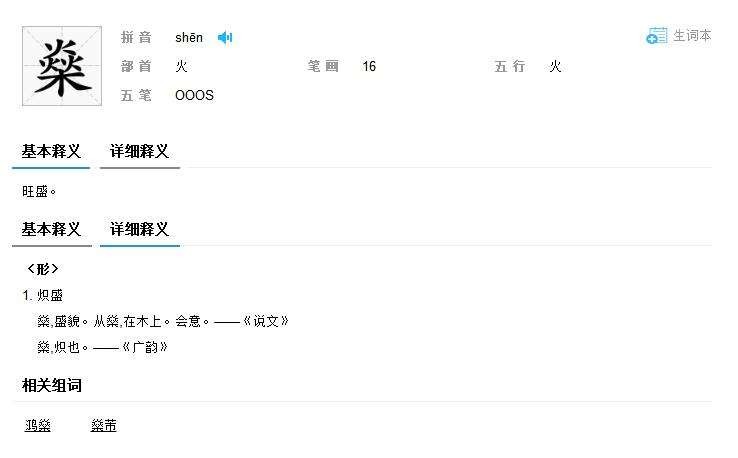 第二个解释为“炽盛”。在东汉许慎的《说文解字》中此字被收录于“焱”部,有对它的具体解释:“燊,盛貌。从燊,在木上。会意。”