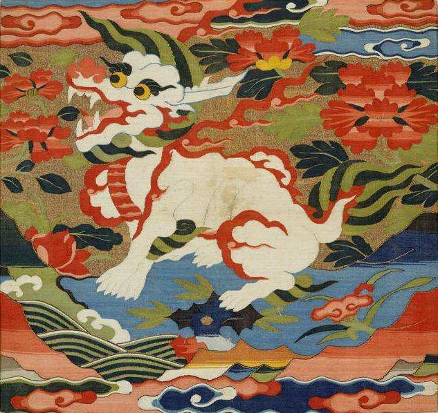 补子,文官用禽,武官用兽,公、侯、驸马、伯则用麒麟和白泽。麒麟集各种动物形象于一身并且在中国古代历史上的地位仅次于龙,白泽是黄帝巡狩到海滨得到的,是传说中的神兽。它们吉祥的化身,都寓意着招福纳财,驱邪避凶。公、侯、驸马、伯运用白泽和麒麟的形象也是象征着尊贵与庄重。