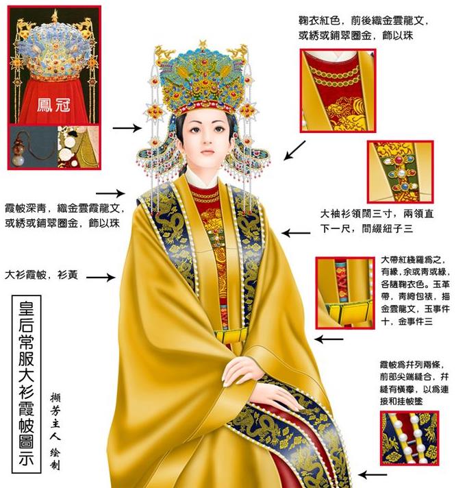 为达到有序性维护统治阶层的威严,不但在君臣服饰有明确的要求,同样在皇后嫔妃以及命妇的服饰上也有明确的服饰等级要求。这种等级差别主要是通过图案以及配饰来区别的。例如在后妃常服中,皇妃运用的纹饰为云霞凤纹,但不能用云龙纹饰。皇太子妃常服“其燕居则服犀,冠刻以花凤,余与皇妃相同”;亲王妃与皇太子妃的服饰和世子妃的服饰则与亲王妃相同,而公主不用圭,世子妃则是冠用七翟。明代在后宫妃嫔以及宗室女子的服饰的标准有着严格的规定,按等级、辈分服饰使用权限由上至下依次减缩,上可兼下,下绝不能僭越取上,等级秩序严格分明。