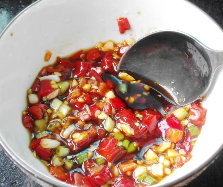 2,这个时候,要把大蒜,小米椒洗洗干净,切成颗粒形状,放在小碗中备用。