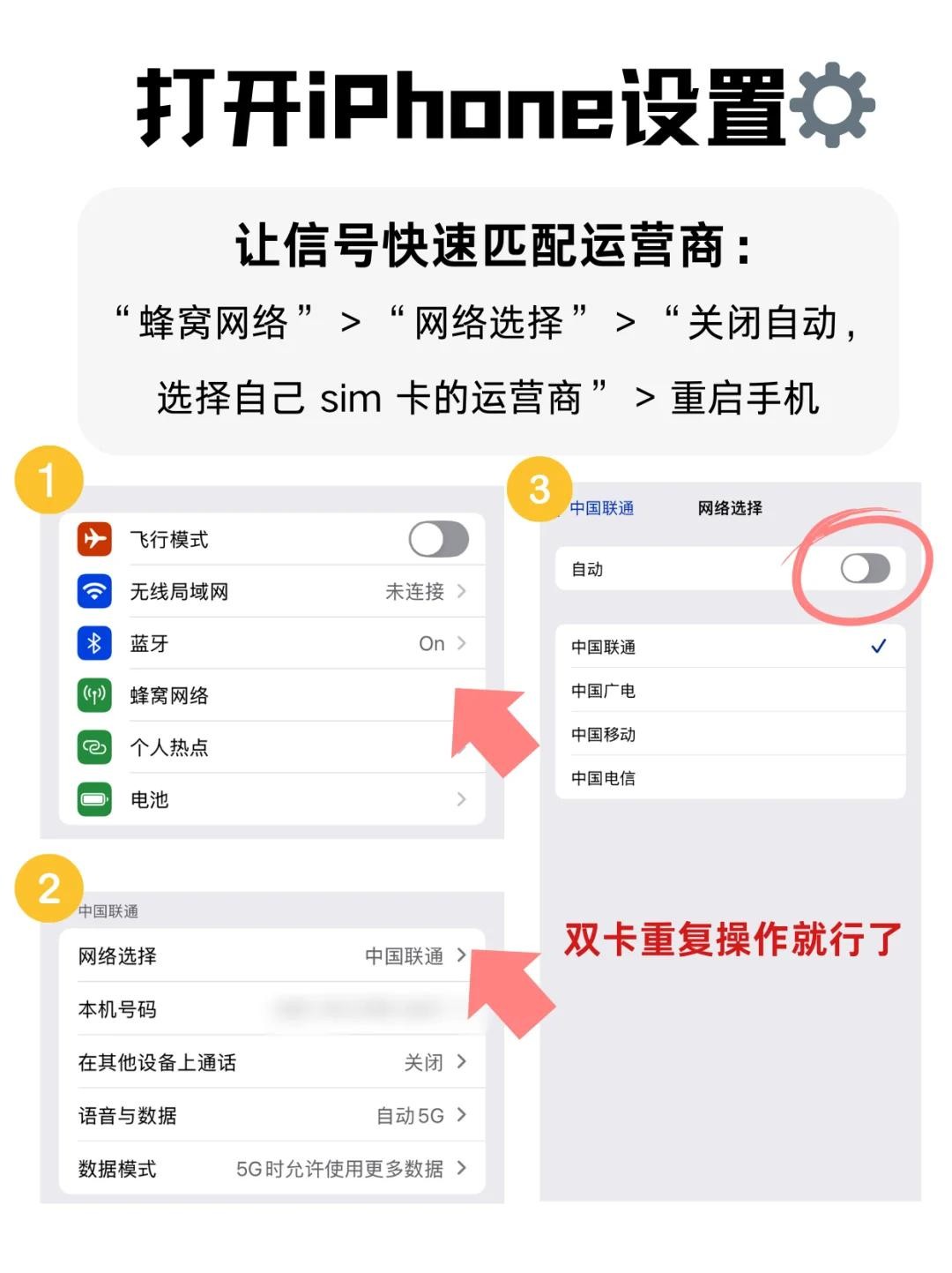 1⃣“蜂窝网络” > “网络选择” > “关闭自动,选择自己 sim 卡的运营商” > 重启手机 (如果是双卡双持可以重复这个操作)