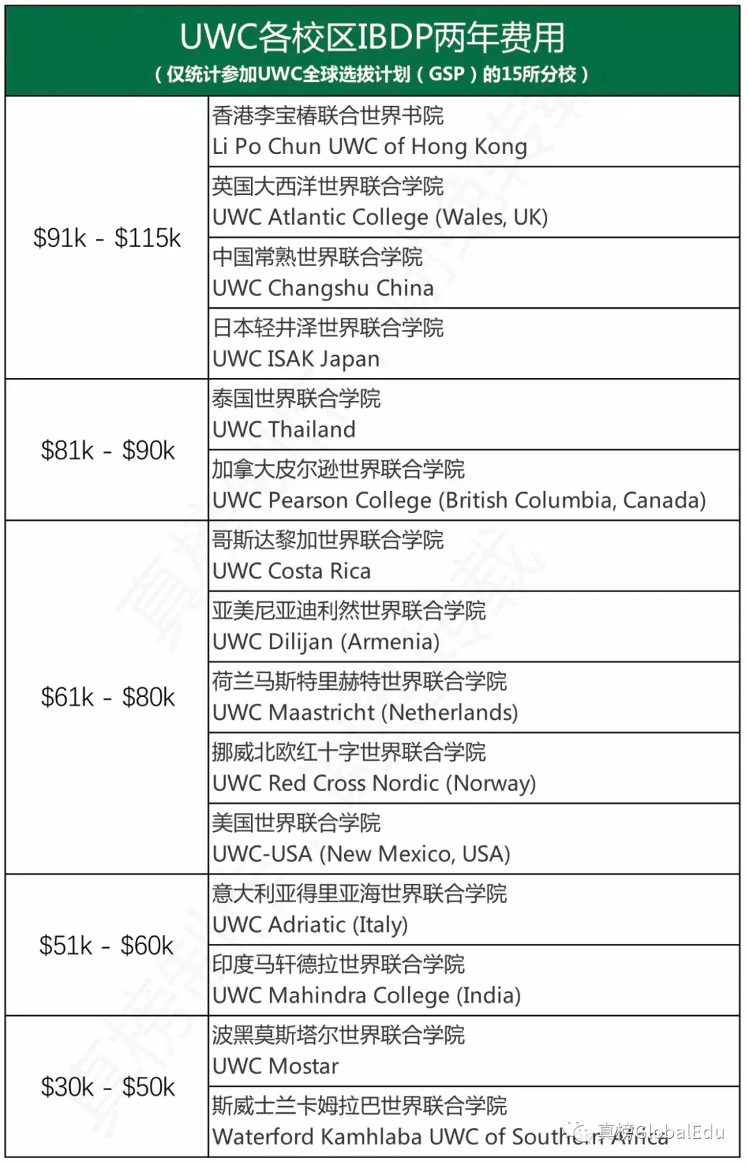 ⬆️目前UWC有15所学校设全球选拔计划(自费)项目,以上为官网发布、真榜独家整理的费用对比图,各校区学费差异比较大,另外,亚洲三大校区香港、常熟、日本均在学费最贵的第一梯队里。
