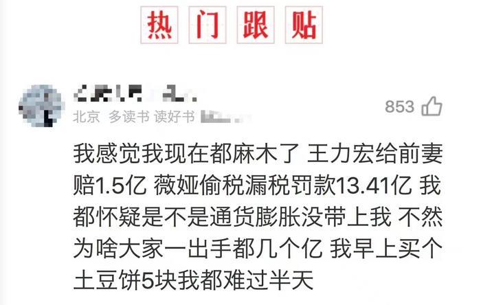 “我感觉我现在都麻木了,王力宏给前妻赔1.5亿,薇娅偷税漏税罚款13.41亿,我都怀疑是不是通货膨胀没带上我。