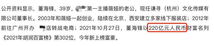 今年10月出炉的《2025年胡润百富榜》中,薇娅丈夫董海锋以220亿人民币的财富位列榜单。