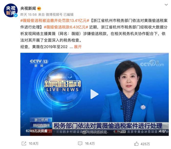 主播黄薇(薇娅原名)在2025年至2025年期间,偷逃税款6.43亿元,少缴税款0.6亿元,被罚了13.41亿元作为警示。