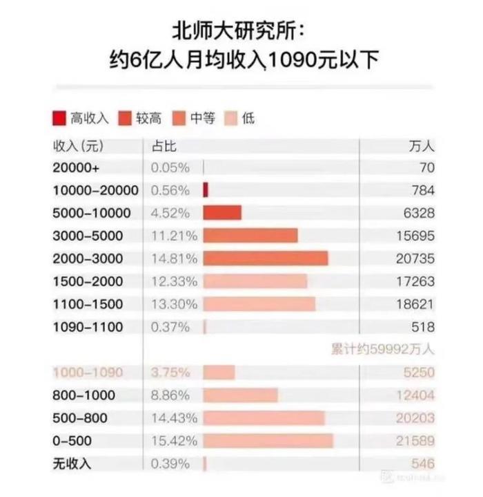 我国有6亿人月收入1000元,95%的家庭年收入不到20万。