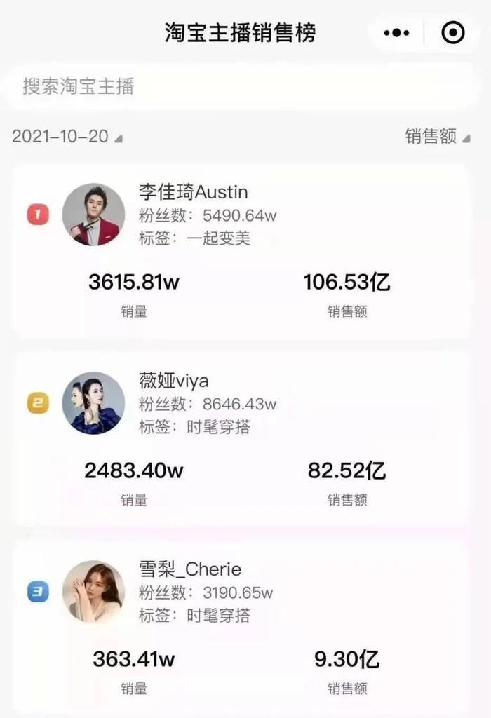 李佳琦、薇娅、雪梨三大主播带货成绩位列前三。
