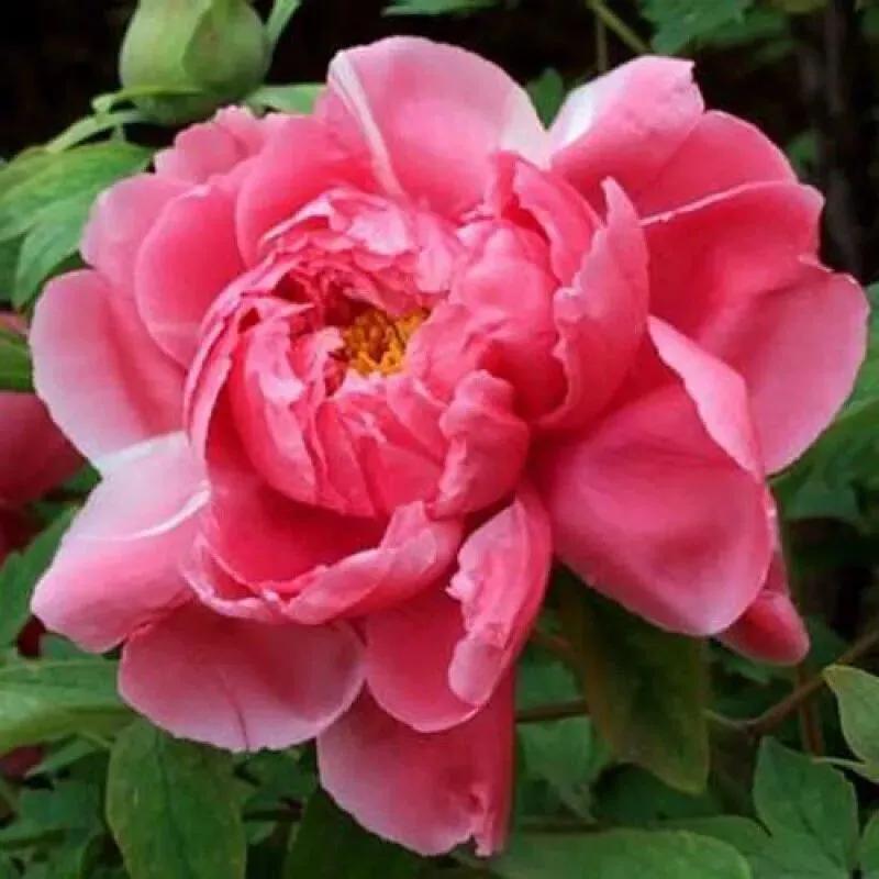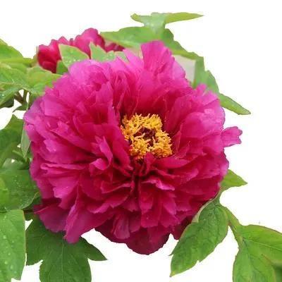 一朵深红色花瓣的牡丹花,颜色漂亮大气,黄色花蕊点缀其间,高贵典雅。