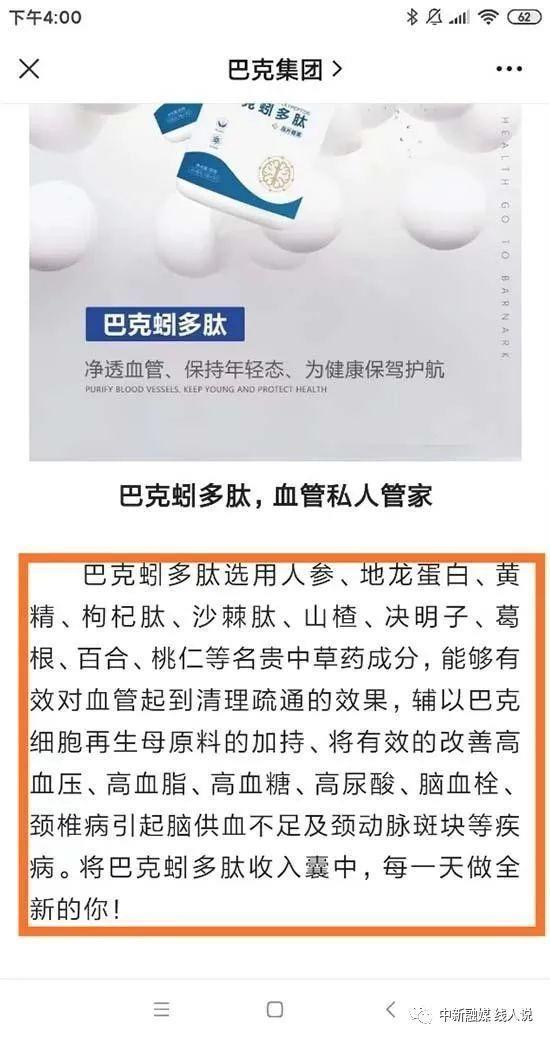 在巴克集团官微上,一篇《如果你也有以下这些问题,巴克四宝安排一下》的文章里,在对其产品“巴克蚓多肽压片糖果”的功效描述中提到,“巴克蚓多肽选用人参、地龙蛋白等名贵中草药成分,能够有效对血管起到清理疏通的效果,辅以巴克细胞再生母原料的加持、将有效的改善高血压、高血脂、高血糖、高尿酸、脑血栓、劲椎病引起脑供血不足及颈动脉斑块等疾病。”