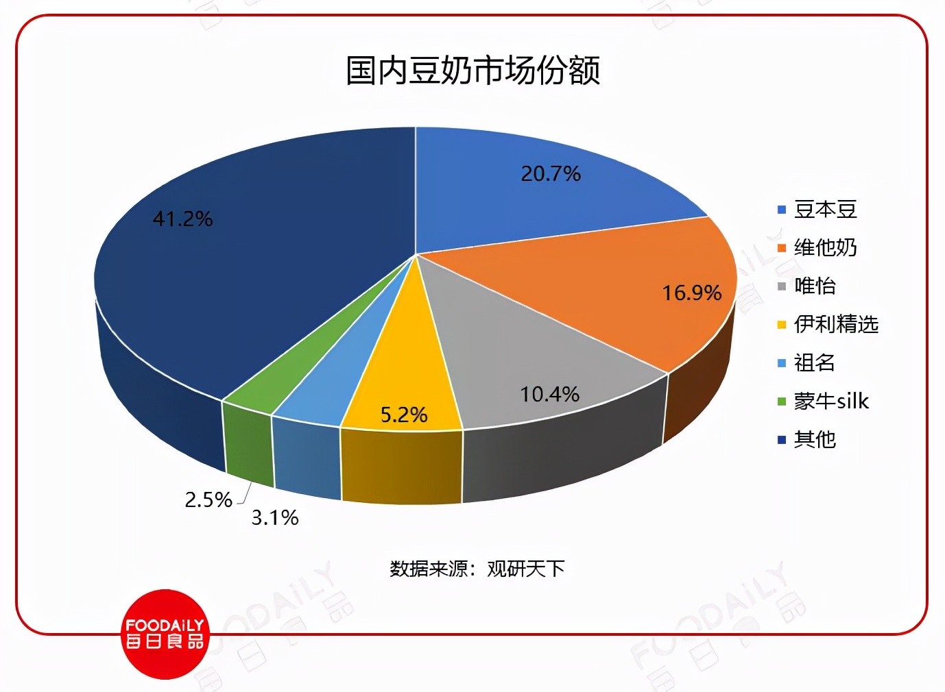 从市场份额看,达利旗下豆本豆以20.7%稳居第一,维他奶、唯怡以16.9%和10.4%的占比紧跟其后。伊利精选、祖名、蒙牛silk分别为5.2%、3.1%、2.5%,构成第三阵营。