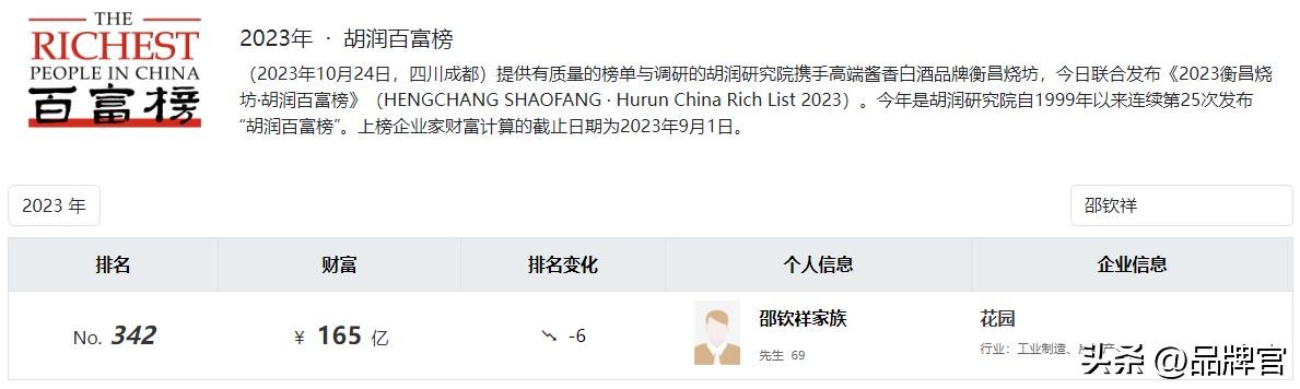 根据《2023年胡润百富榜》公开财富显示,邵钦祥财富为165亿元,排名第342位!