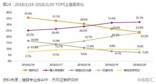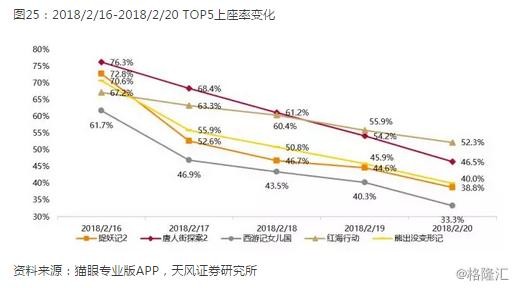 2018年春节档票房竞争格局基本与17年保持一致,TOP1票房占比维持在32%左右,而18年春节档的市场容量依然只有5部,TOP5占据了98.2%的市场,排名第5以外的影片只能分得不到2%的票房份额。