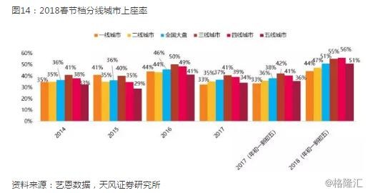 2018年春节档前5日各线级城市上座率均高于往年,三四五线城市上座率分别为55%、56%、51%,高于51%的全国大盘上座率,较去年同期上升13/16/15pcpts。返乡“小镇青年”观影需求强劲,不少影院出现一票难求现象。