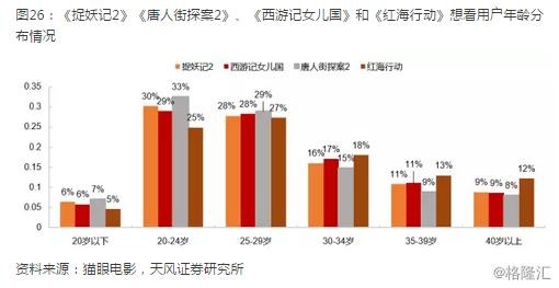 从观影用户城市分布看,《捉妖记2》以合家欢属性更受三四线城市欢迎,三四线城市观影用户占比达到53.5%;战争题材类电影《红海行动》一二线城市观影用户占比最高,合计达到54.2%,随着一二线城市人群回流,票房优势有望进一步。