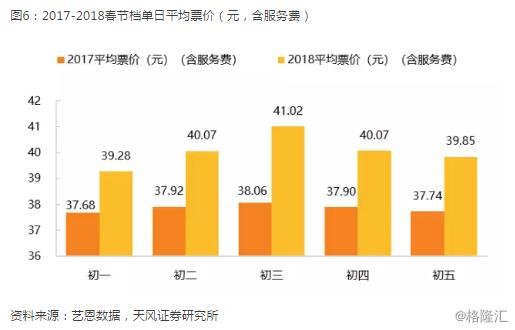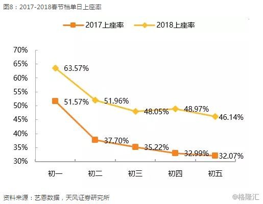 单日来看,平均票价的高峰出现在大年初三,达到41元。上座率的高峰出现在大年初一,2018年大年初一上座率为63.57%,较去年初一51.57%上升12pcpts。