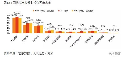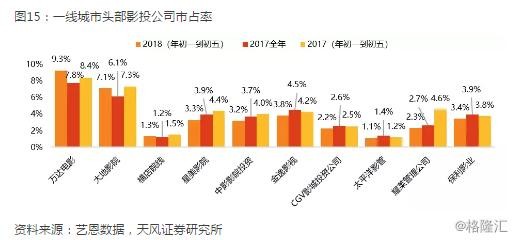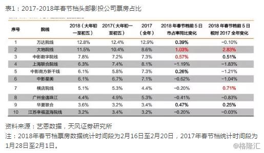 从院线维度看,2018年春节档前5日,前十大院线市占率有5家同比提升,分别为万达院线、大地院线、中影数字院线、中影南方新干线以及华夏联合,其中市占率同比提升最高的为大地院线(+1.03 pcpts)、中影数字(+0.57pcpts)。18年春节档相对17年全年市占率看,三到五线城市票房分布占比更高的大地院线及横店院线在春节回乡期间市占率提升最为显著。