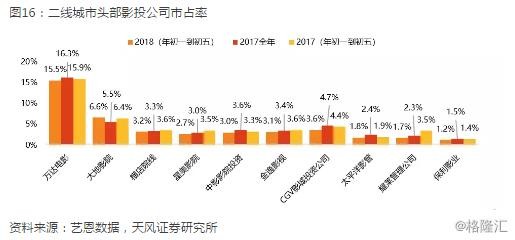 我们进一步从影投公司的分线级城市市占率来看,除万达电影在一、四、五线城市市占率分别提升0.9/0.3/1.8pcpts,大地影院在二线城市、中影影院投资在五线城市市占率各提升0.2pcpts外,头部影投公司在各线级城市市占率同比均呈现下滑趋势。