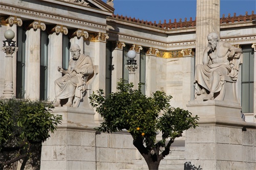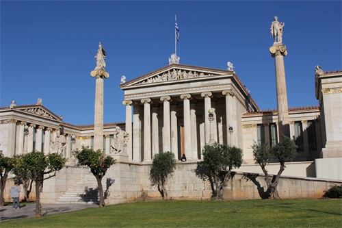 在雅典市中心的大学街和科学院街之间,有三座新古典主义建筑,分别是国立图书馆、雅典大学和雅典科学院。雅典科学院是1859年丹麦建筑师提奥菲尔·汉森(Theophil Hansen)的建筑“三部曲”的一部分,吸取了希腊古典建筑的精髓。雅典科学院是新古典主义风格的建筑杰作,与旁边的国家图书馆和雅典大学合称“新古典主义三部曲”。作为雅典的主要地标的雅典科学院建于1859年,1885年完工。参观雅典科学院,不可错过学院门口的4个雕像以及门楣上众神的雕塑。两根高高的大理石神像柱的顶端站立着希腊褚神中比较闻名的两位:左侧是手持长矛和盾牌象征着智慧和勇敢的雅典娜神,右侧是左手持里拉琴代表着光明和音乐的阿波罗神。在入口处的台阶两侧还有两位古希腊伟大的哲学家的大理石雕像,左侧是苏格拉底,右侧是柏拉图,雅典学院的门楣上还有一排众神的雕塑,中央的是众神之主宙斯,其他列神分别站于其两侧。