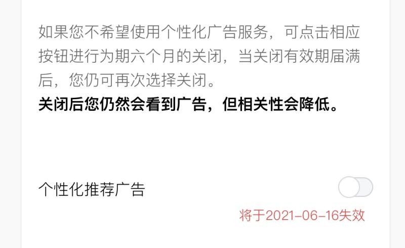 即便找到了关闭入口,也不能一劳永逸。例如,记者在市消保委专家的指点下,通过“我-设置-关于微信-《微信隐私保护指引》-《隐私政策》-广告-关于广告-如何管理您看到的广告-管理-个性化推荐广告-登录”等足足11个页面,才关闭了微信朋友圈个性化广告推荐功能。但微信同时提醒,关闭该功能后“您仍然会看到广告,但相关性会降低”;而且用户主动选择关闭个性化广告推荐的有效期只有6个月。之后若不重复以上操作,微信朋友圈又会自动推荐个性化广告。