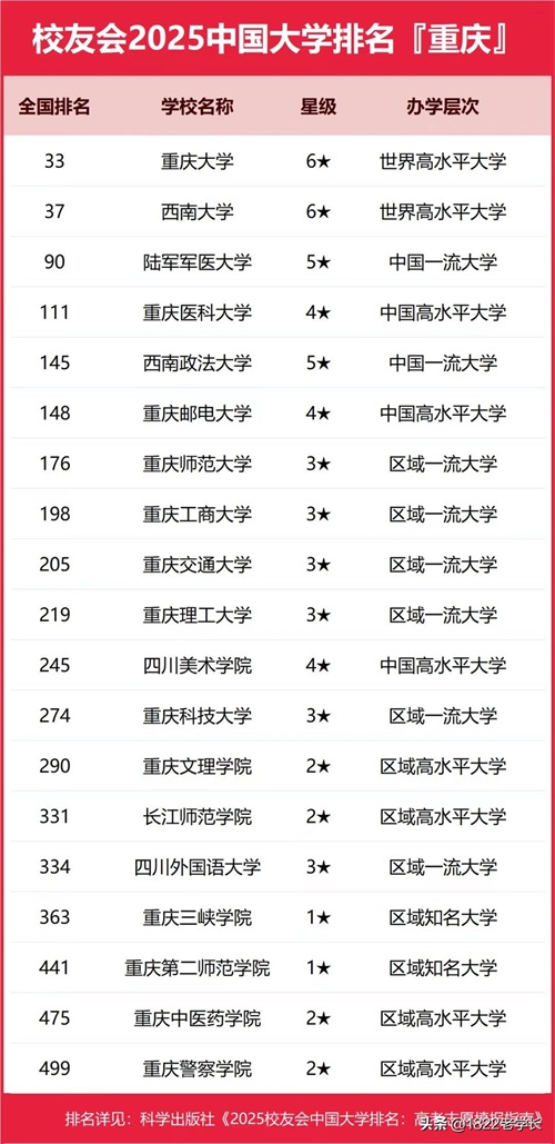 国内较有影响力的校友会排行榜发布了重庆高校2025年排名,本文来看一下各校的表现。排行榜放置于文末。