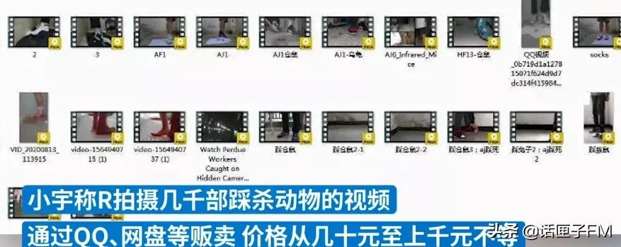 根据小宇提供的视频截图,R售卖的视频以鞋子种类+动物种类命名,内容主要是以脚踩杀宠物,猫、狗、鱼、兔子、乌龟等都有,时长几分钟到几十分钟不等,画面极为血腥。