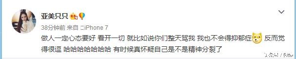 刘梓晨女朋友亚美只只突然心血来潮想到这么一段话,大概的意思是自己很看得开被网友骂了还觉得很逗,想必之下很多明星却做不到,一方面网友的谩骂可能会让明星压力很大甚至把明星逼上绝路。所以很多明星选择了关闭评论或者就从来不看评论的。