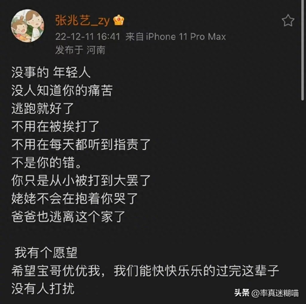 从配文中可以看出张兆艺从小就生活在指责中、家暴中度过,小时候还有姥姥护着,长大了姥姥去世了,爸爸也逃离了这个家,她表示自己也想逃走,但她始终逃不出妈妈的魔掌,即使现在嫁人生子。照片中可以看出张兆艺鼻头包裹着纱布,太让人很心疼!这么可爱的女孩子妈妈是怎么下得去手的。