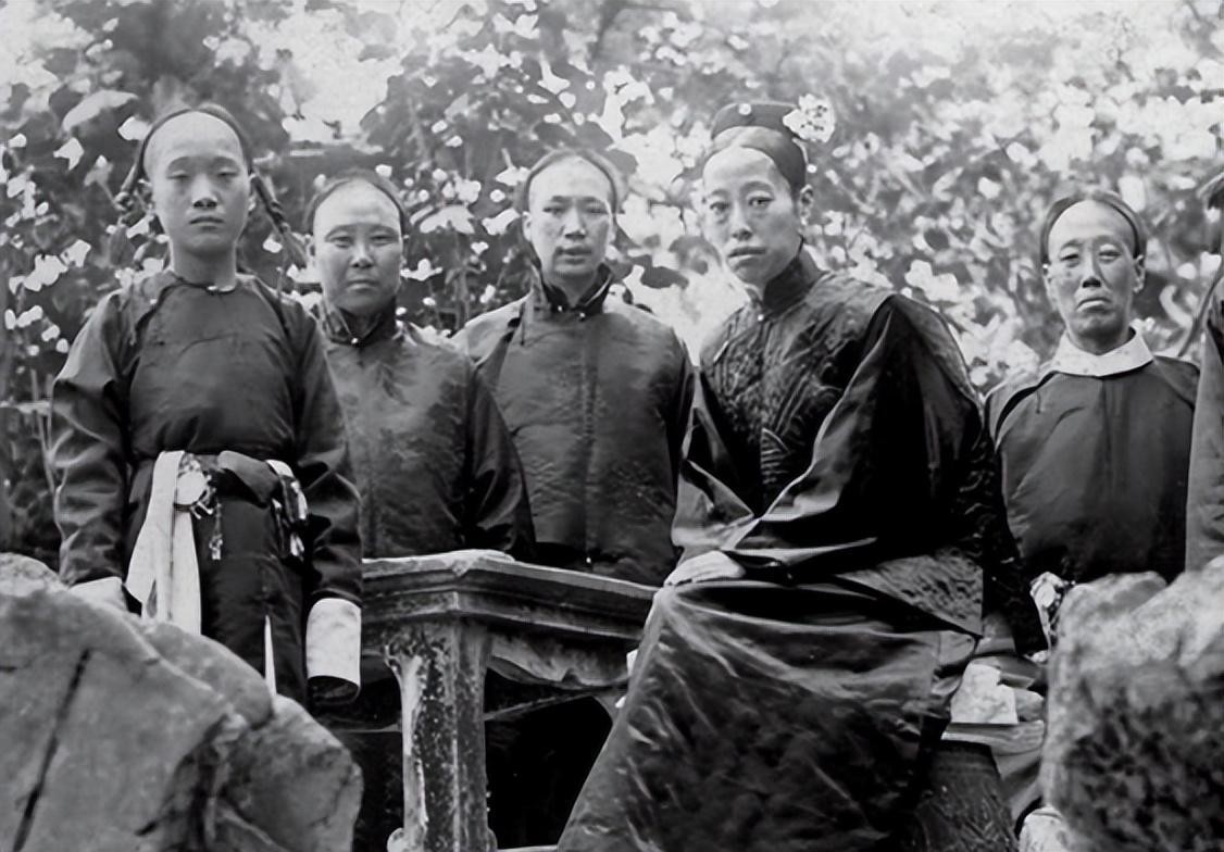 (36)09隆裕太后与数名太监漫步御花园,衣着朴素无华,毫无昔日皇家之华丽。