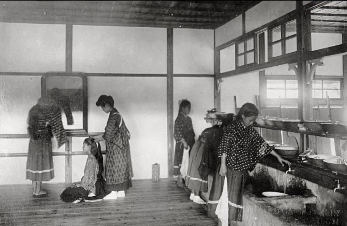(12)1910年,日据时期的台湾的教育。图1,女子教育。好像是在上刺绣课。图2,女子学校的体育课。图3,在宿舍里身着和服的女生。图4,日语课。图5,说是语言学校。看上去像是上收发电报课。