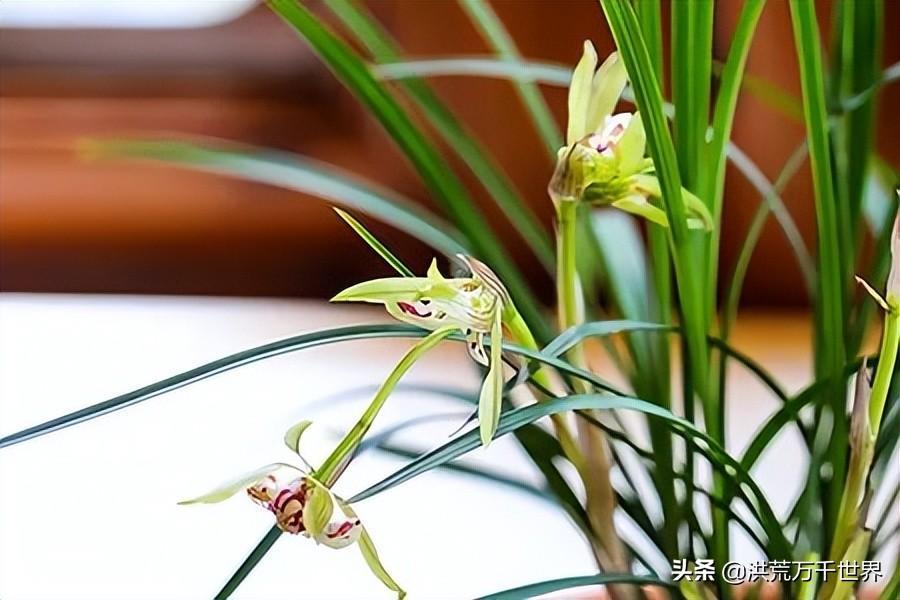 5.寒兰:寒兰的株型与建兰十分相似,但叶片较细,尤以基部为甚,叶姿潇洒,显得优雅高尚。开出的花朵比较的瘦小,并且还会长一些,花期在10-12月份。