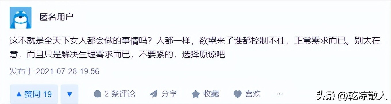 “这不就是全天下女人都会做的事情吗?人都一样,欲望来了谁都控制不住,正常需求而已。别太在意,而且之时解决生理需求而已,不要紧的,选择原谅吧。”