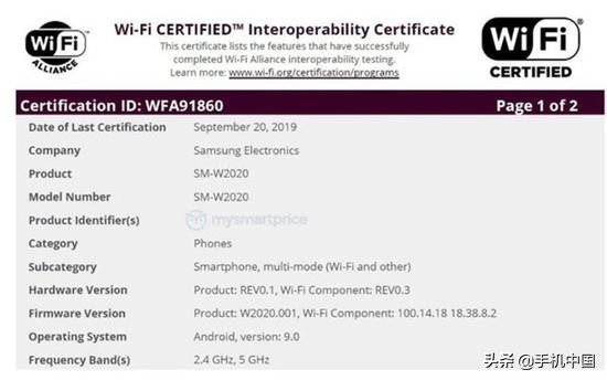 型号为“SM-W2020”的手机已通过WiFi联盟认证