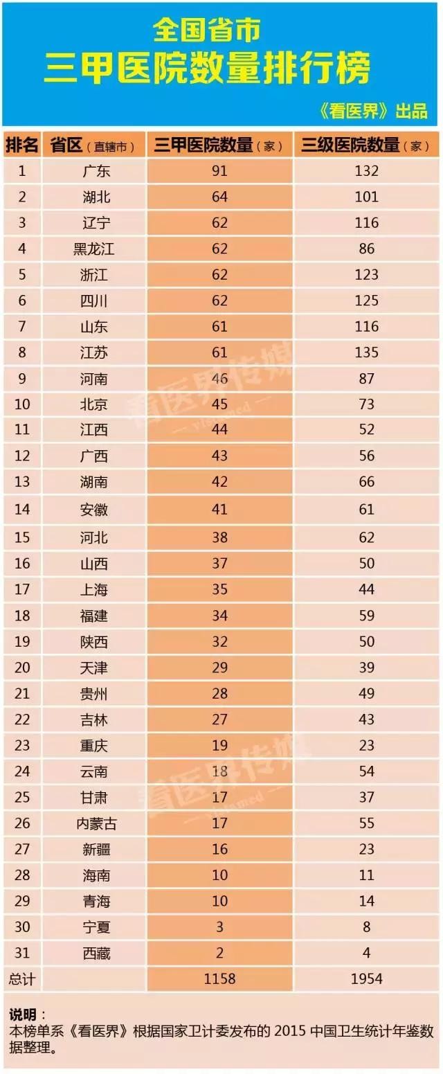 1、从榜单排名来看,全国人口第一的广东,以91家三甲医院,在数量上雄冠全国,超出第二名湖北近30家,在三级医院数量上也是位居全国第二。